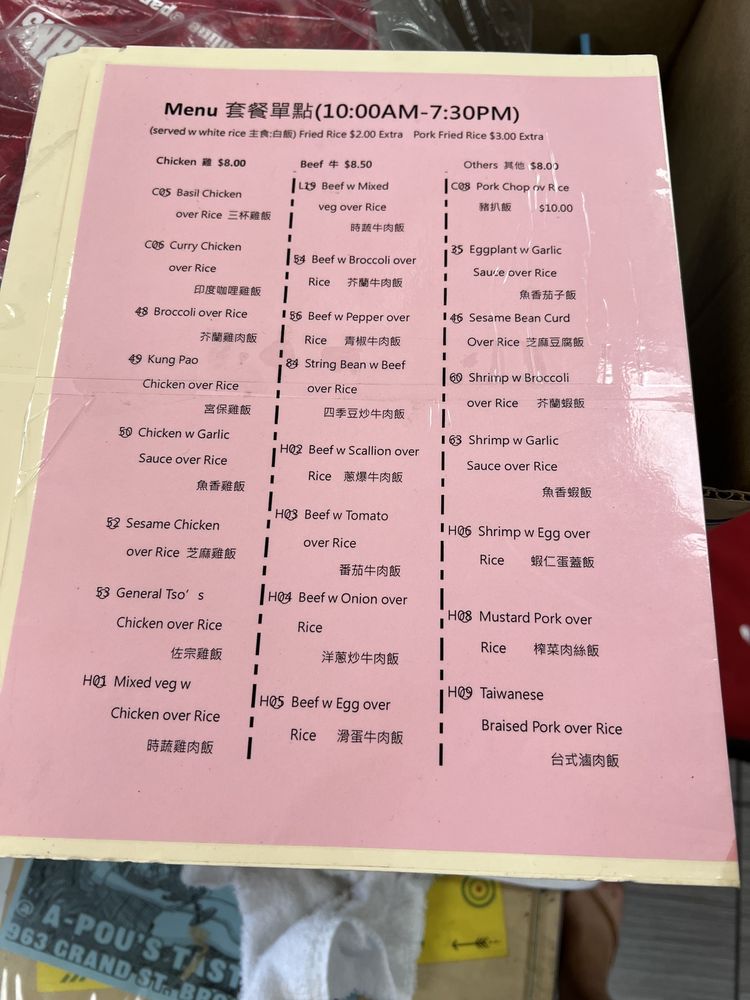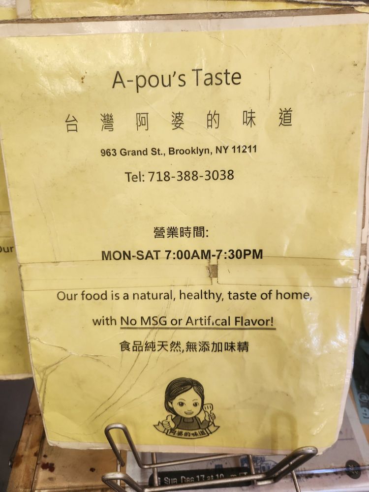 Located in Brooklyn, NY, A-Pou’s Taste offers a wide range of Taiwanese-Chinese noodles and other dishes. This casual, wheelchair-accessible restaurant provides delivery, takeout, reservations, and even caters to dietary preferences with vegan and vegetarian options. The menu features flavorful choices like Beef Noodle Soup, Seafood Wonton Soup, and Braised Pork Over Rice. Customers rave about the cozy atmosphere and friendly service, with Grandma A-pou personally welcoming guests. Reviews highlight the tender Taiwanese Braised Pork and the affordable prices, making it a must-visit spot for authentic Taiwanese cuisine lovers. Don't miss out on their crispy potstickers or the must-try Basil Chicken Over Rice. A-Pou’s Taste stands out for its delicious, comforting dishes and excellent value.